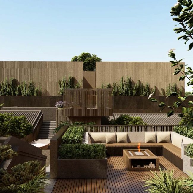 以大小不一的庭院空间串接酒店功能, 将客房化整为零形成若干院落单元,放置于屋顶之上 。